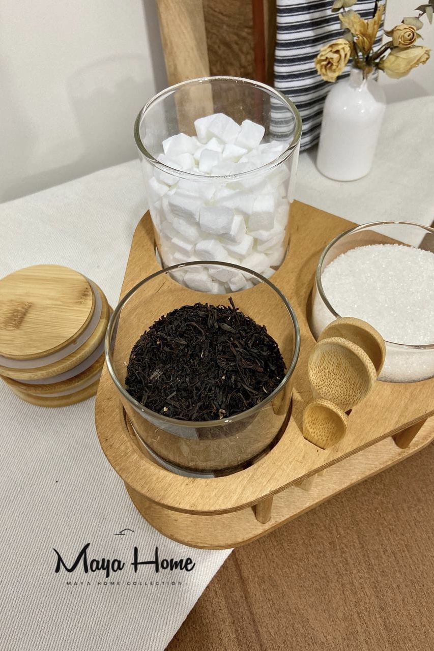 استند بانکه مثلثی سانا به همراه سه بانکه پیرکس و قاشق چوبی