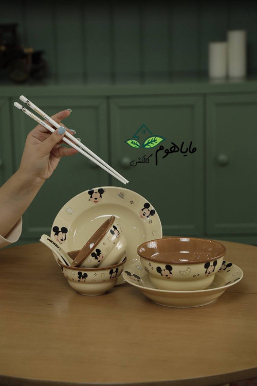 متعلقات: دو بشقاب غذاخوری، دو پیاله، یک کاسه ی بزرگ، دو قاشق، دو جفت چاپستیک