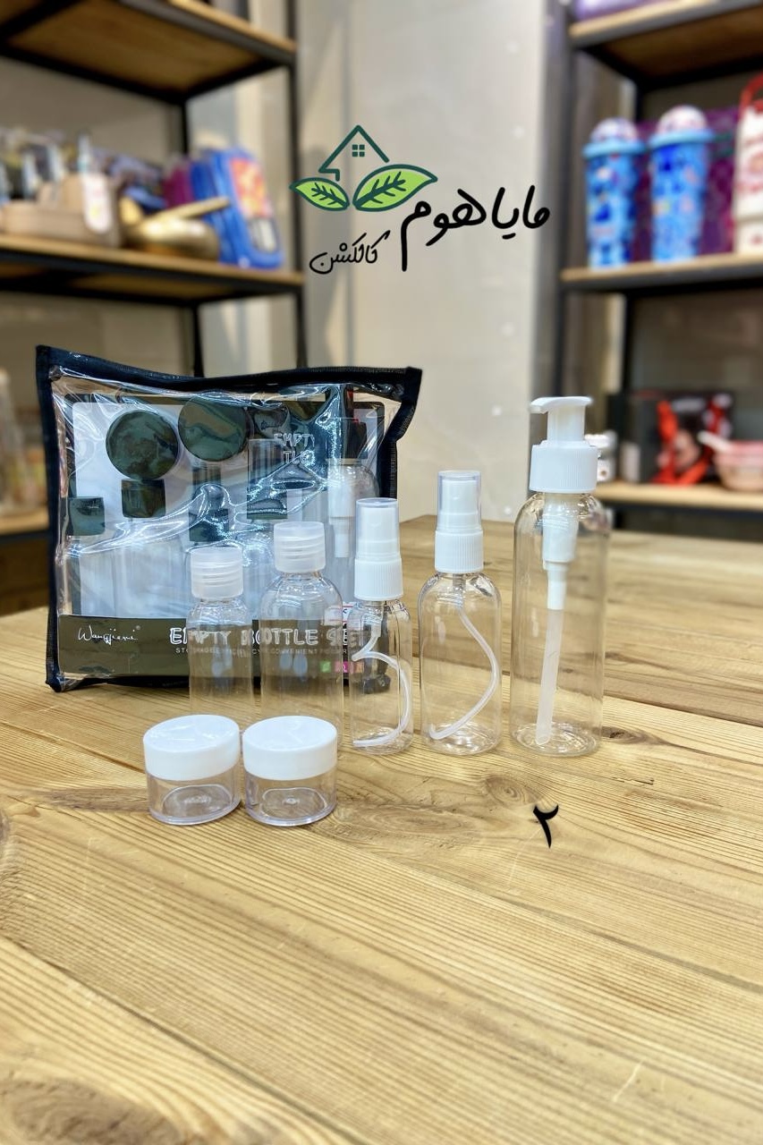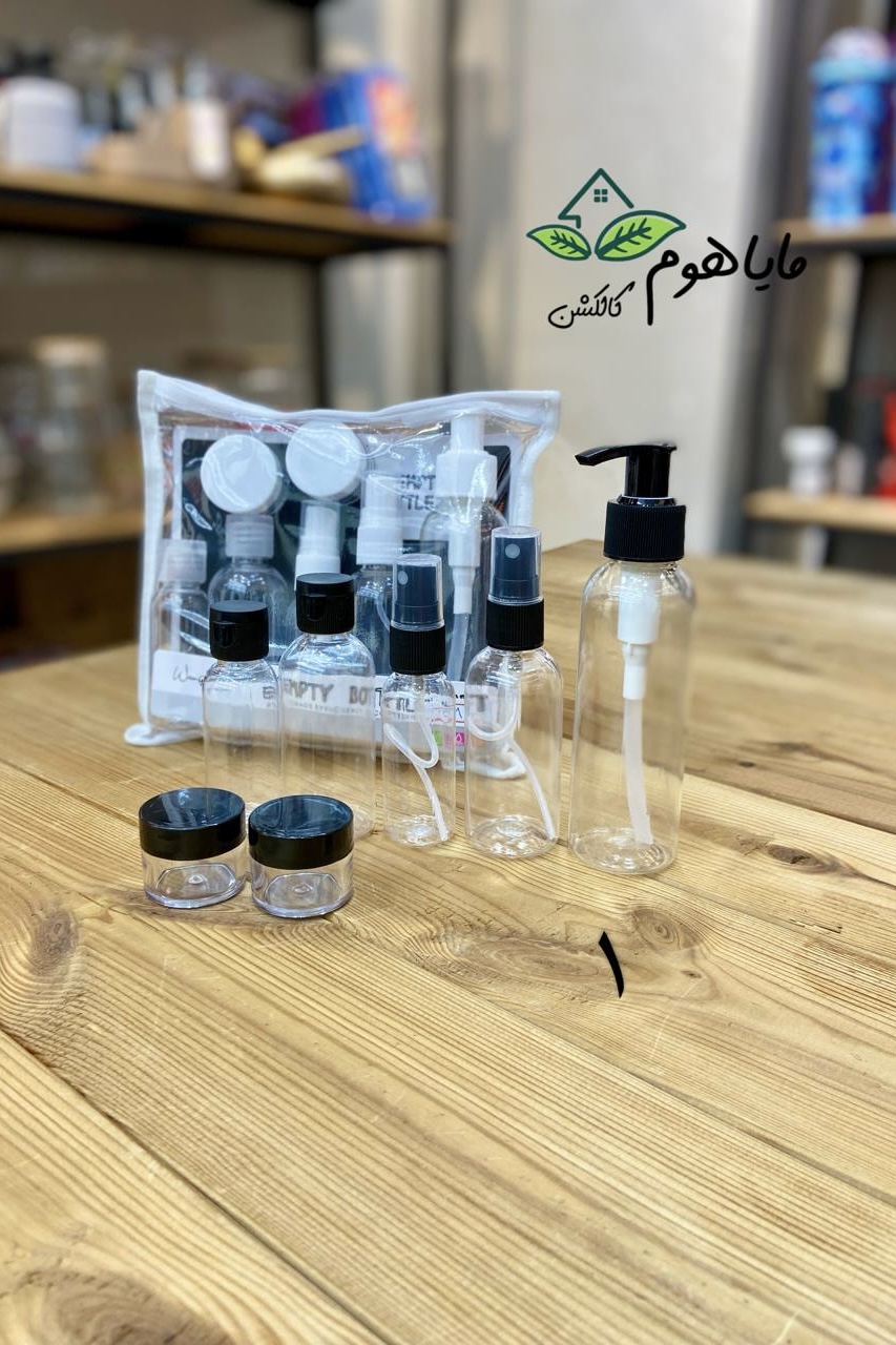 پک 9 تیکه شامل : 1 عدد ظرف پمپی: مناسب شامپو،شوینده و .. 2 عدد ظرف اسپری:مناسب میسلارواتر، تونر و .. 2 عدد ظرف فشاری: مناسب شامپوبدن، مرطوب کننده و … 2 عدد کاسه شیشه ای : مناسب کرم،مرطوب کننده، آبرسان و .. 1 عدد قیف : برای ریختن شوینده و .. درون ظرف ها 1 کاردک و کیف شفاف که بطری ها درون کیف قرار میگیرند.